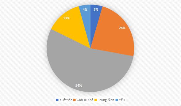 Dữ liệu cụ thể cho thấy sự phân hóa rõ rệt trong kết quả học tập. Số sinh viên đạt mức “Xuất sắc” là 8 em, tương đương 4% tổng số sinh viên. Nhóm sinh viên đạt mức “Giỏi” có số lượng lớn hơn đáng kể với 48 em, chiếm 23%. Đáng chú ý, phần lớn sinh viên tập trung ở mức “Khá” với 113 em, chiếm tỷ lệ cao nhất là 54%. Bên cạnh đó, vẫn còn một bộ phận sinh viên cần được quan tâm khi có 29 em đạt mức “Trung bình” (14%) và 11 em đạt mức “Yếu” (5%).